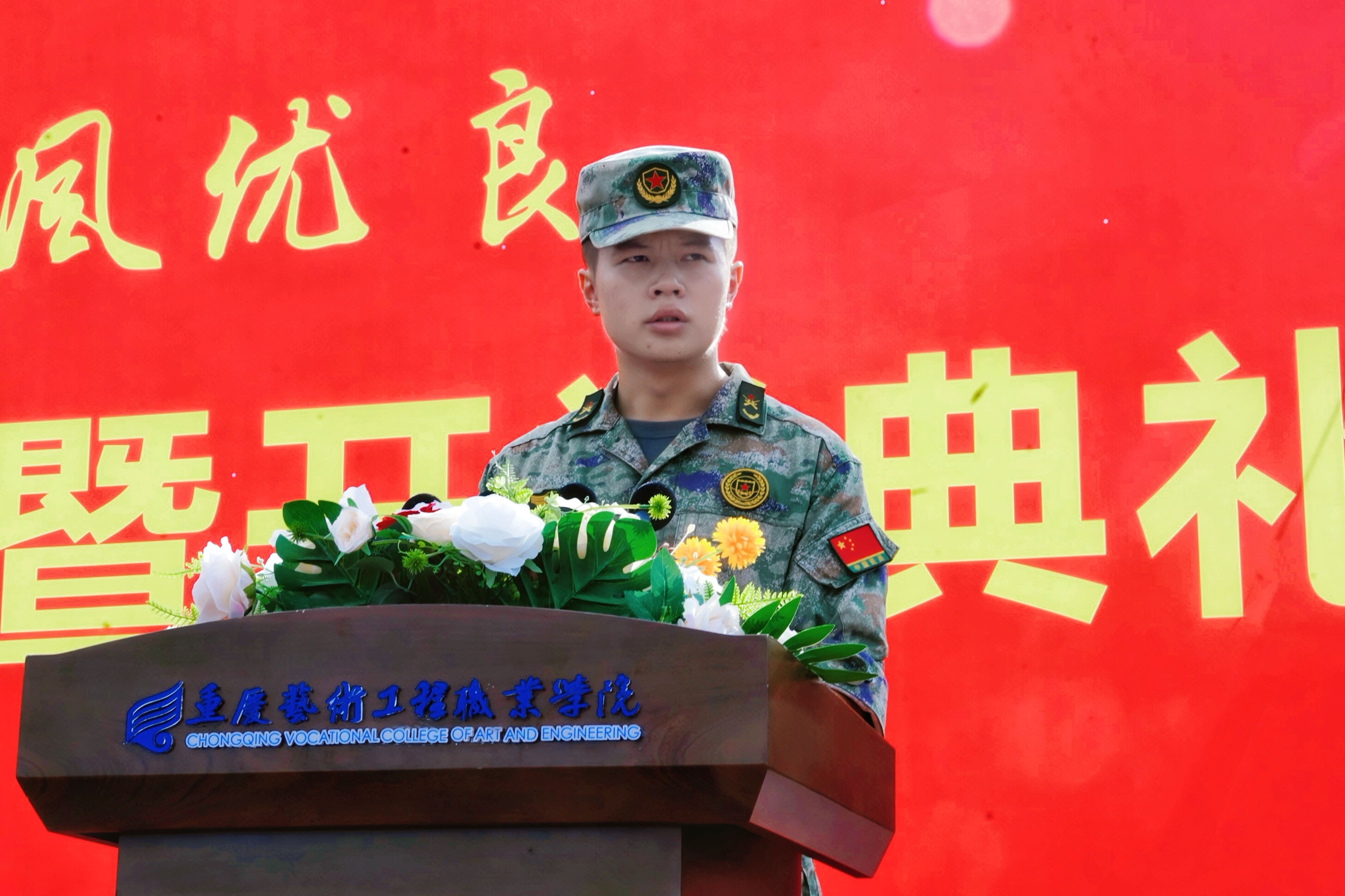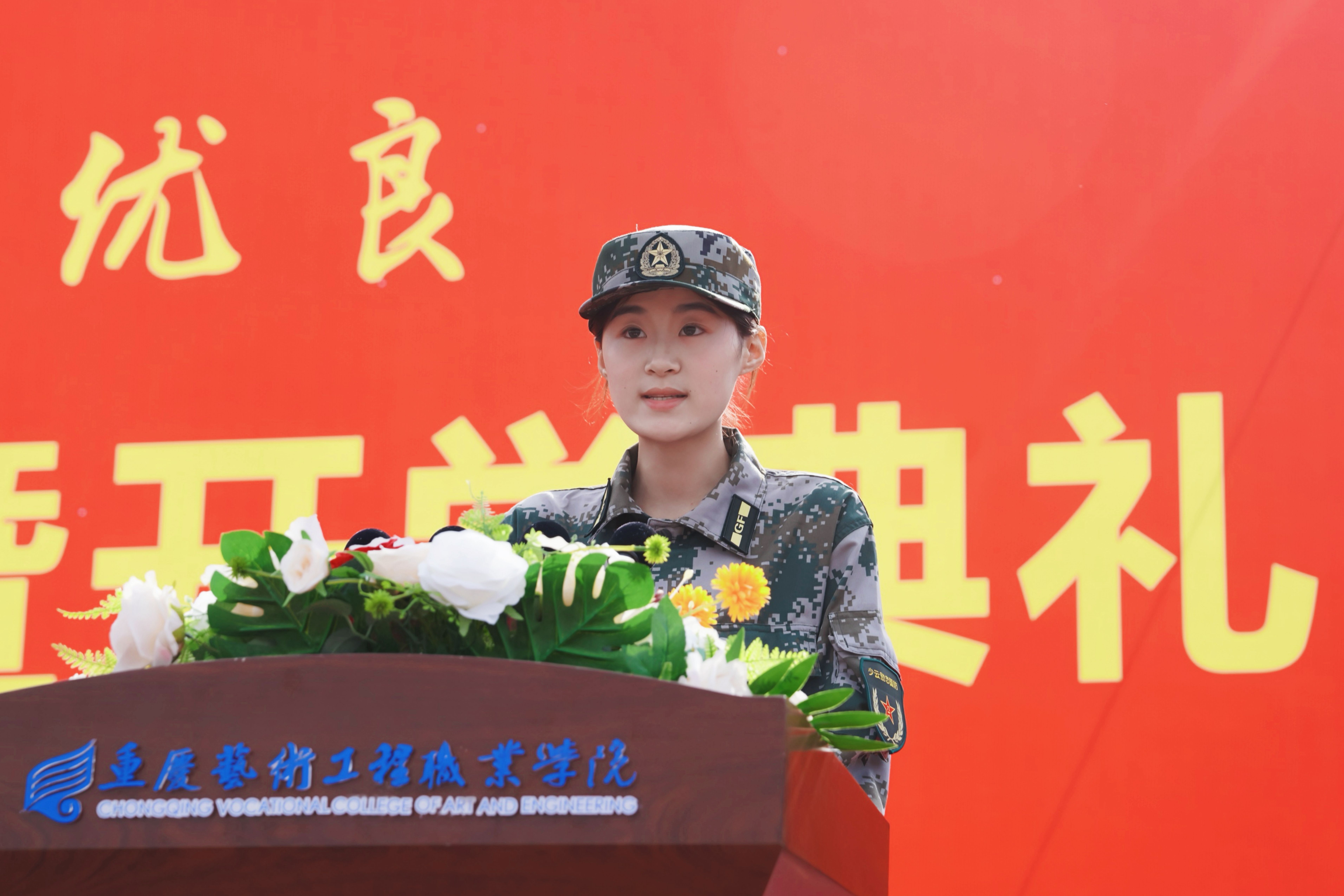 许校长列举了音乐与表演学院师生团队耐得住寂寞,守得住艰辛,扛得住压力,勇夺2025年世界职业技能大赛总决赛金奖的事迹。以及作为专职配送员的2017届校友廖泽萌,秉持脚踏实地的奋斗精神,今年“五一”受到中共中央、国务院表彰,被评为“全国劳动模范”,获得全国五一劳动奖章、全国三八红旗手、全国五一巾帼标兵荣誉称号。希望同学们向他们学习,对未来满怀信心,对奋斗充满激情,在军训中展示“艺工”学子的风采,不怕艰苦,不怕困难,听从命令,服从指挥,认真训练,挑战自我,圆满完成军训任务!