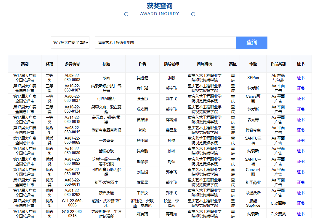 9月15日,第十七届全国大学生广告艺术设计大赛经过公示将获奖名单揭晓,重庆艺术工程职业学院学子斩获国赛二等奖1项、三等奖4项、优秀奖9项,省赛一等奖9项、二等奖9项、三等奖20项、优秀奖333项,且荣获优秀组织奖。