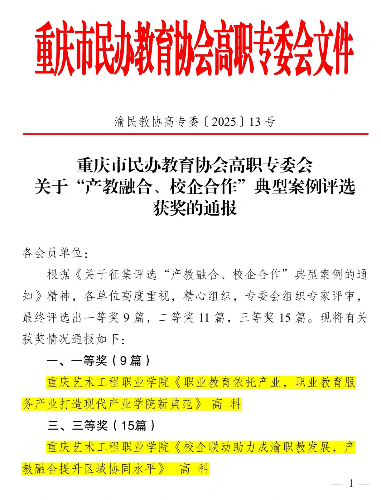 2025年11月5日,重庆市民办教育协会高职专委会发布“产教融合、校企合作”典型案例评选结果通报。此次评选获各单位积极响应,经专家评审,共评出一等奖9篇、二等奖11篇、三等奖15篇。