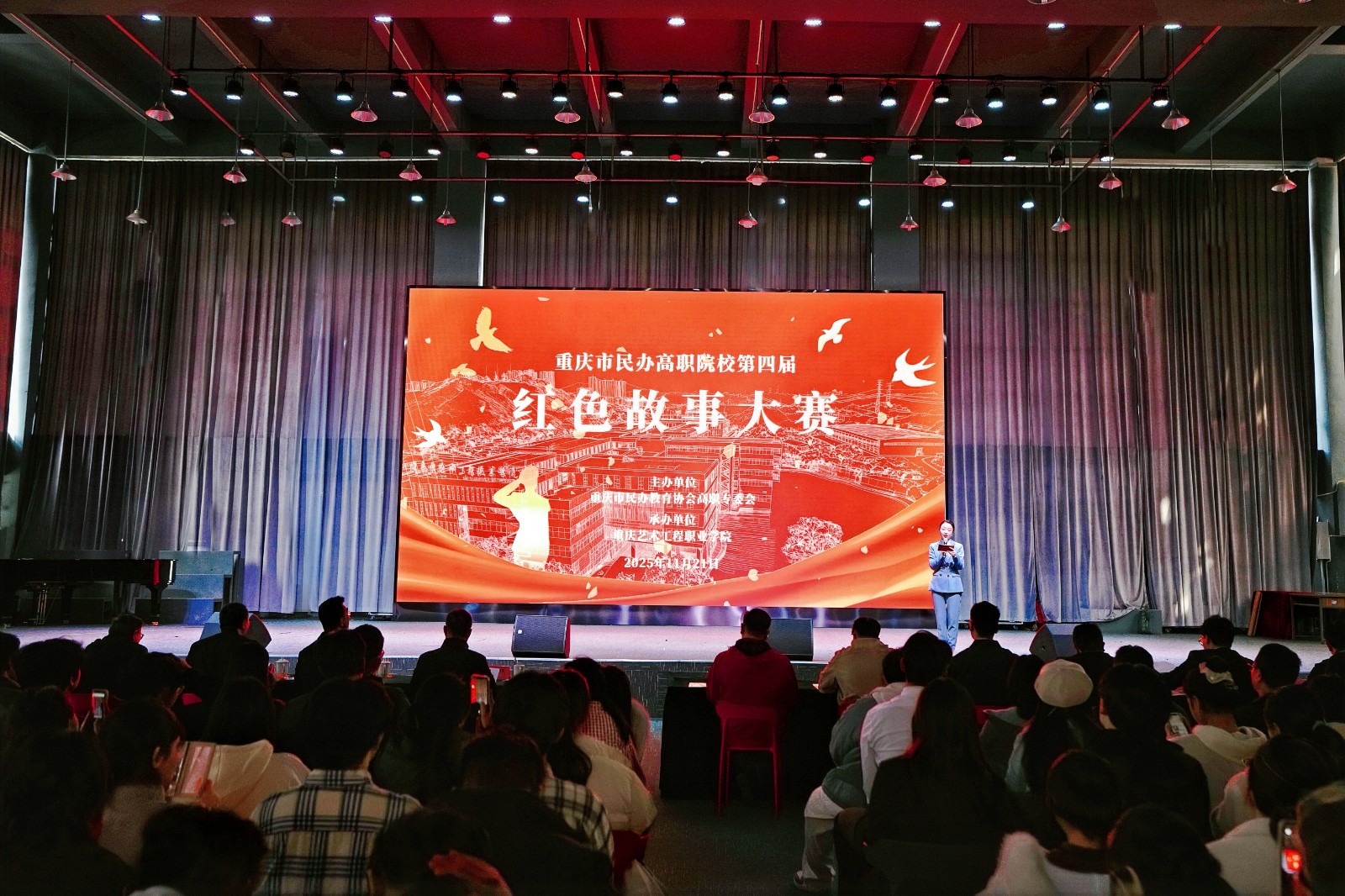 2025年11月21日,我校图书馆多功能厅气氛热烈,由重庆市民办教育协会高职专委会主办的第四届红色故事大赛在此隆重举行。来自全市20所民办高职院校的参赛队伍齐聚一堂,以赤诚之心、深情之语,传承红色基因,弘扬革命精神,奏响了一曲曲激昂的红色乐章。