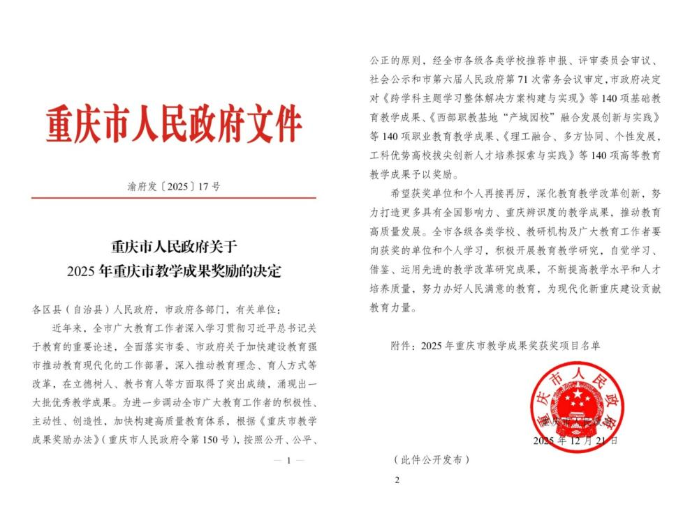 近日,重庆市人民政府发布了《重庆市人民政府关于2025年重庆市教学成果奖励的决定》,按照公开、公平、公正的原则,经全市各级各类学校推荐申报、评审委员会审议、社会公示和市第六届人民政府常务会议审定,市政府决定对140项基础教育教学成果、140项职业教育教学成果、140项高等教育教学成果予以奖励。