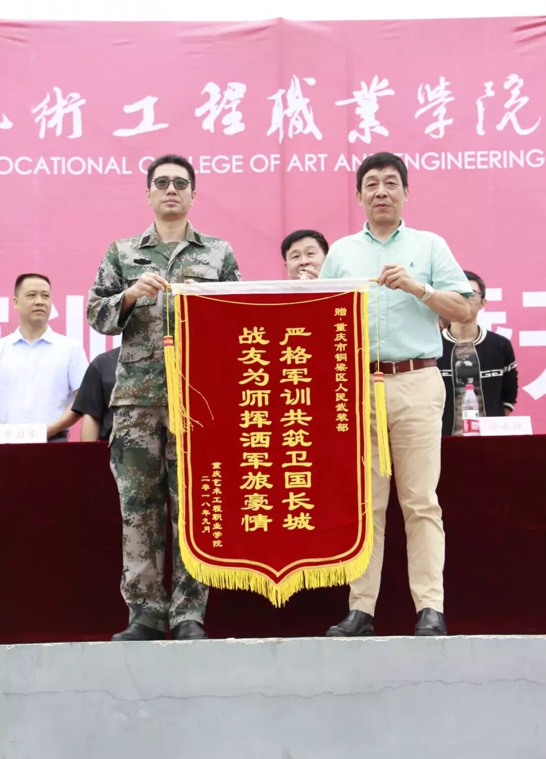 许锡宾校长代表学校将一面锦旗赠送给铜梁区人民武装部,锦旗上书写着两行大字:"严格军训共筑卫国长城,战友为师挥洒军旅豪情"。