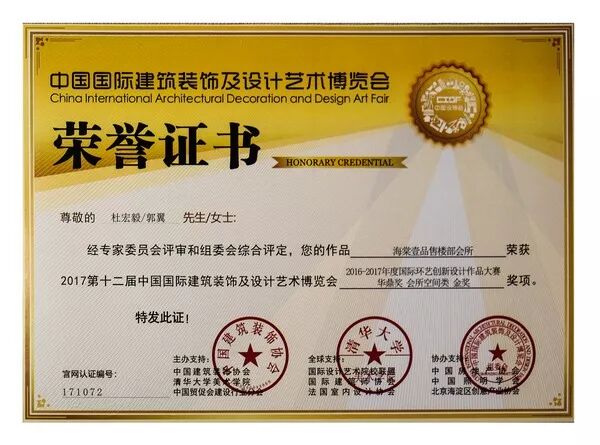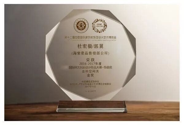 我校艺术设计学院副院长、教授杜宏毅与郭翼共同设计的"海棠壹品售楼部会所",在2017年11月参加由中国建筑装饰协会、清华大学美术学院、中国国际建筑装饰及设计艺术博览会主办的第十二届中国国际建筑装饰及设计艺术博览会中,荣获2016-2017年度国际环艺创新设计作品大赛华鼎奖会所空间类金奖。